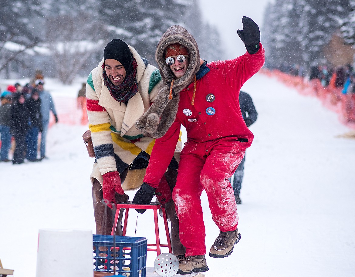 Despite temperatures in the low single digits and steady light snow, a merry band of racers and watchers turned out for the 41st annual Cabin Fever Days Bar Stool races Saturday on Sugar Hill in Martin City. Winds were actually light, compared to Columbia Falls, where it was howling. The races continue today (Sunday) at 1 p.m. and 3 p.m. (finals). It should be cold again, but with light winds.