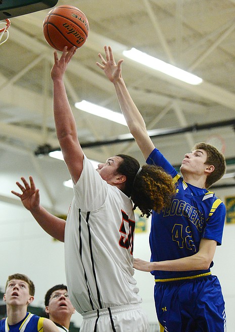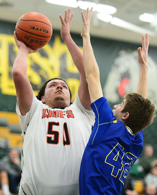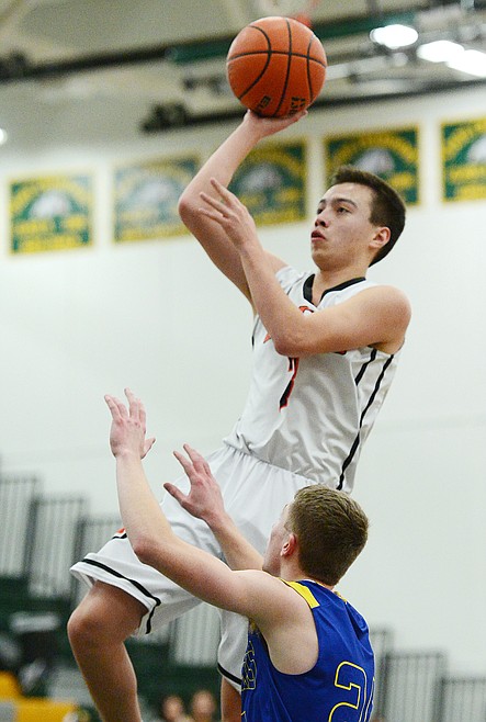 Ronan's Jacob Gatch (13) shoots over Libby's Ryggs Johnston (23) at Whitefish High School on Thursday. (Casey Kreider/Daily Inter Lake)