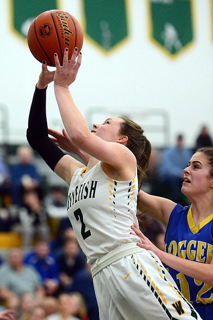 Whitefish's Kaiah Moore (2) drives to the hoop against Libby's Alli Collins (12) at Whitefish High School on Thursday. (Casey Kreider/Daily Inter Lake)
