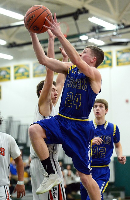 Libby's Jay Beagle (24) drives to the hoop against Ronan at Whitefish High School on Thursday. (Casey Kreider/Daily Inter Lake)