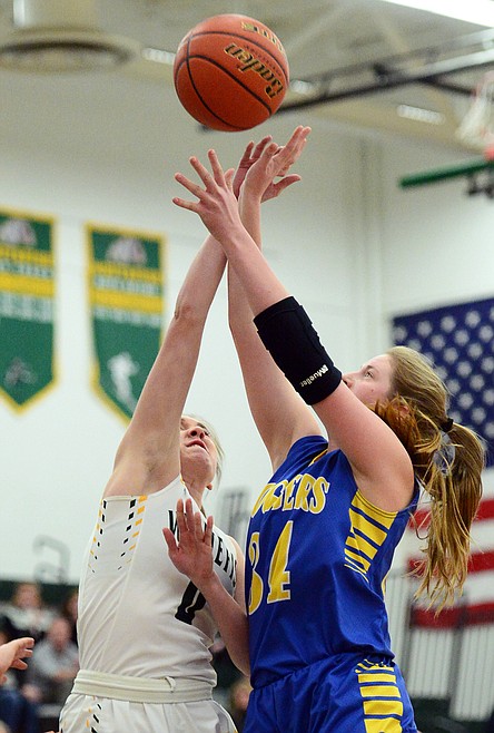 Libby's McKenzie Proffitt (34) looks to shoot with Whitefish's Kit Anderson (0) defending at Whitefish High School on Thursday. (Casey Kreider/Daily Inter Lake)