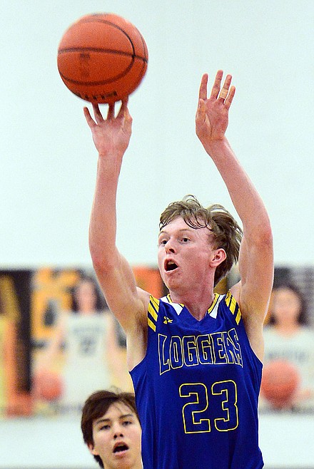 Libby's Ryggs Johnston (23) gets an open look at a three in the first half against Ronan at Whitefish High School on Thursday. (Casey Kreider/Daily Inter Lake)