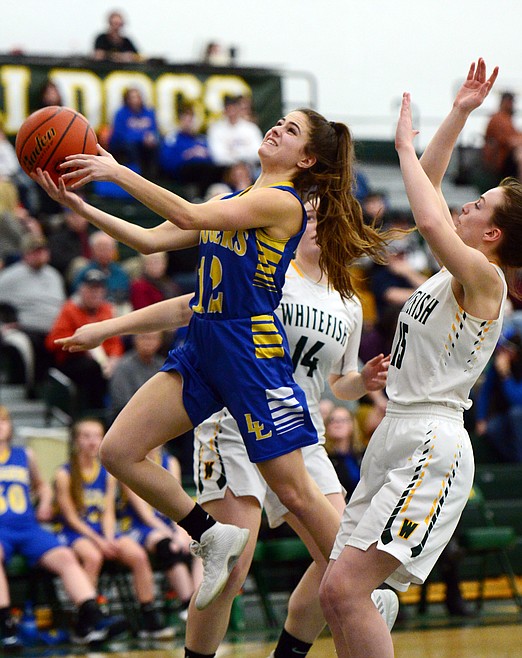 Libby's Alli Collins (12) drives to the basket with Whitefish's Gracie Smyley (14) and Payton Kastella (15) defending at Whitefish High School on Thursday. (Casey Kreider/Daily Inter Lake)