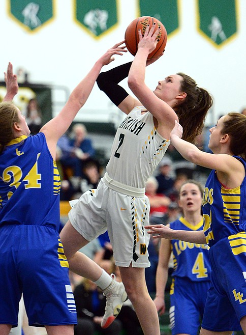 Whitefish's Kaiah Moore (2) drives to the basket between Libby defenders McKenzie Proffitt (34) and Jayden Winslow (24) at Whitefish High School on Thursday. (Casey Kreider/Daily Inter Lake)