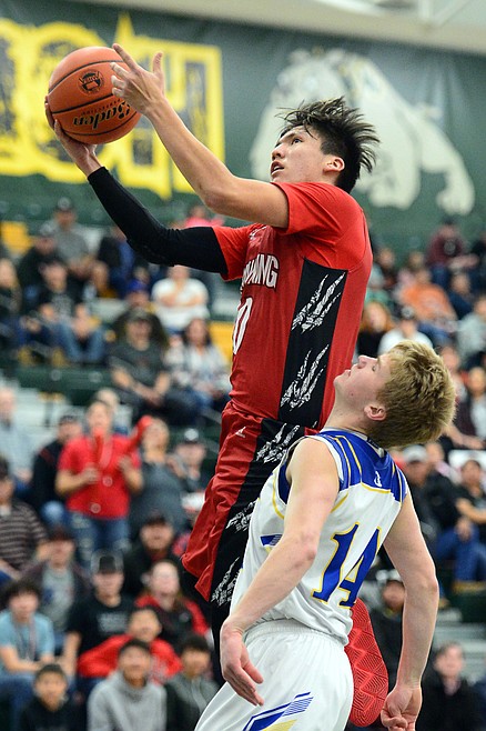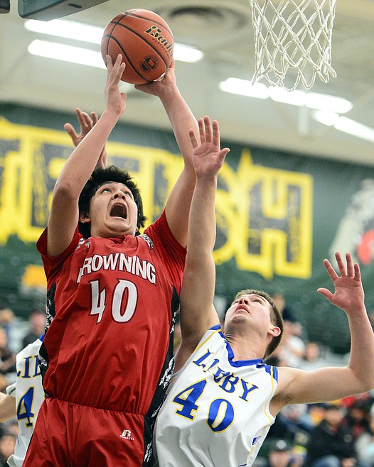 Browning's Derek Sharp (14) drives to the basket in front of Libby's Ryggs Johnston (23) at Whitefish High School on Friday. (Casey Kreider/Daily Inter Lake)
