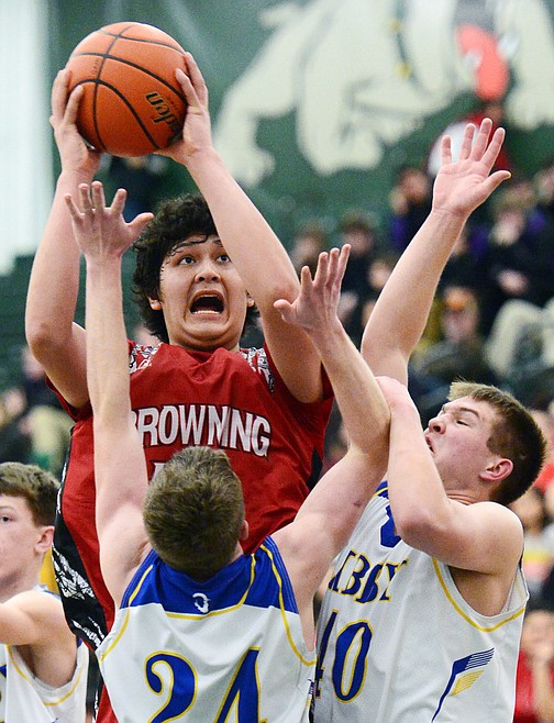 Browning's Tyree Whitcomb (40) looks to shoot over Libby defenders Jay Beagle (24) and JJ Davis (10) at Whitefish High School on Friday. (Casey Kreider/Daily Inter Lake)