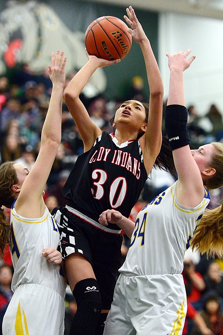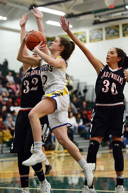 Browning's Dulci Skunkcap (30) drives to the hoop between Libby defenders Jayden Winslow (24) and McKenzie Proffitt (34) at Whitefish High School on Friday. (Casey Kreider/Daily Inter Lake)