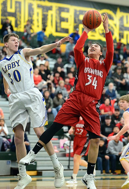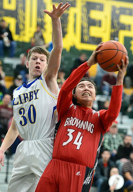 Browning's Deion Mad Plume (34) drives to the hoop in front of Libby's Caden Williams (30) at Whitefish High School on Friday. (Casey Kreider/Daily Inter Lake)