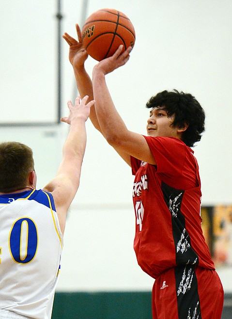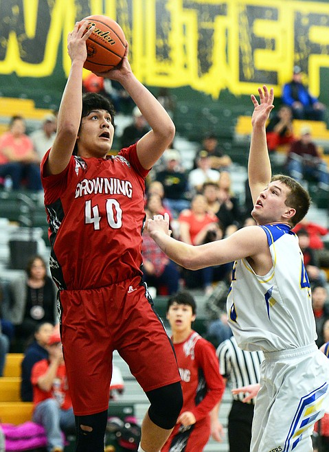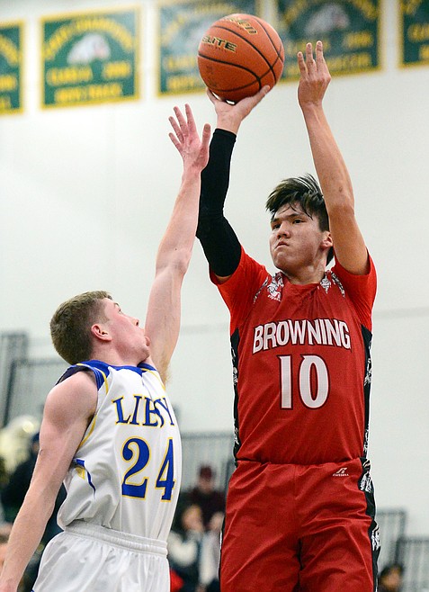 Browning's Tyree Whitcomb (40) shoots over Libby's Tim Goodman (40) at Whitefish High School on Friday. (Casey Kreider/Daily Inter Lake)