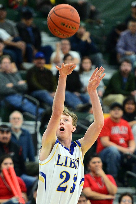 Libby's Ryggs Johnston (23) gets an open look at a three against Browning at Whitefish High School on Friday. (Casey Kreider/Daily Inter Lake)