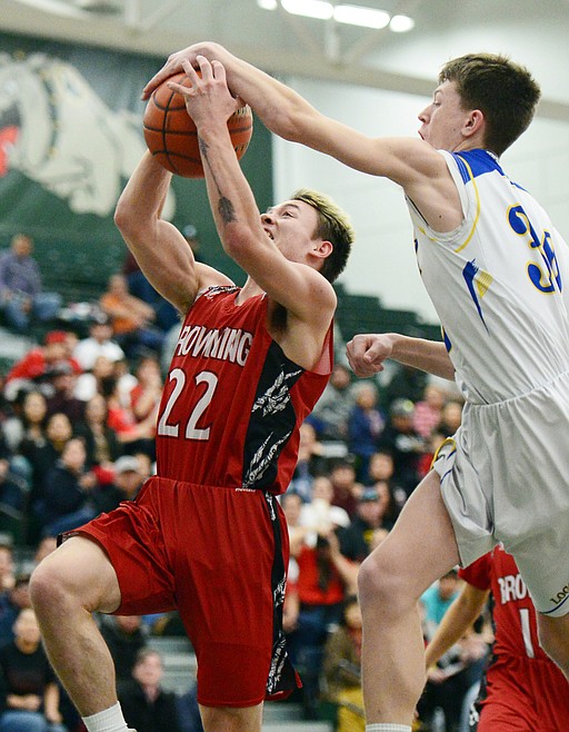 Browning's Brant Bremner (22) drives to the basket with Libby's Caden Williams (30) defending at Whitefish High School on Friday. (Casey Kreider/Daily Inter Lake)
