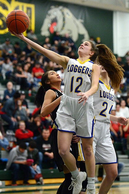 Libby's Alli Collins (12) drives to the basket against Browning at Whitefish High School on Friday. (Casey Kreider/Daily Inter Lake)