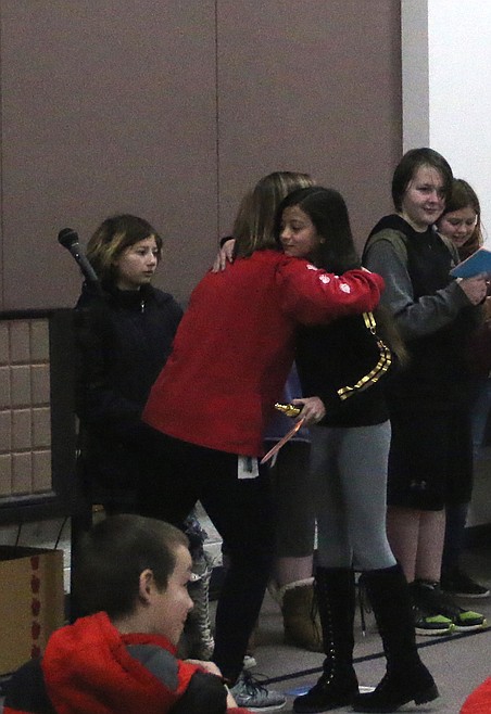 The Feb. 8 assembly concluded with the school’s second quarter awards ceremony, where students were awarded for their achievements by their respective teachers. Sixth-grader Athena Welker won a special trophy for her STEaM skills, particularly in the areas of technology and engineering. Her teacher, Wilma Hahn, said Athena aspires to be an engineer and had an impressive run with her drone on a Lego obstacle course.