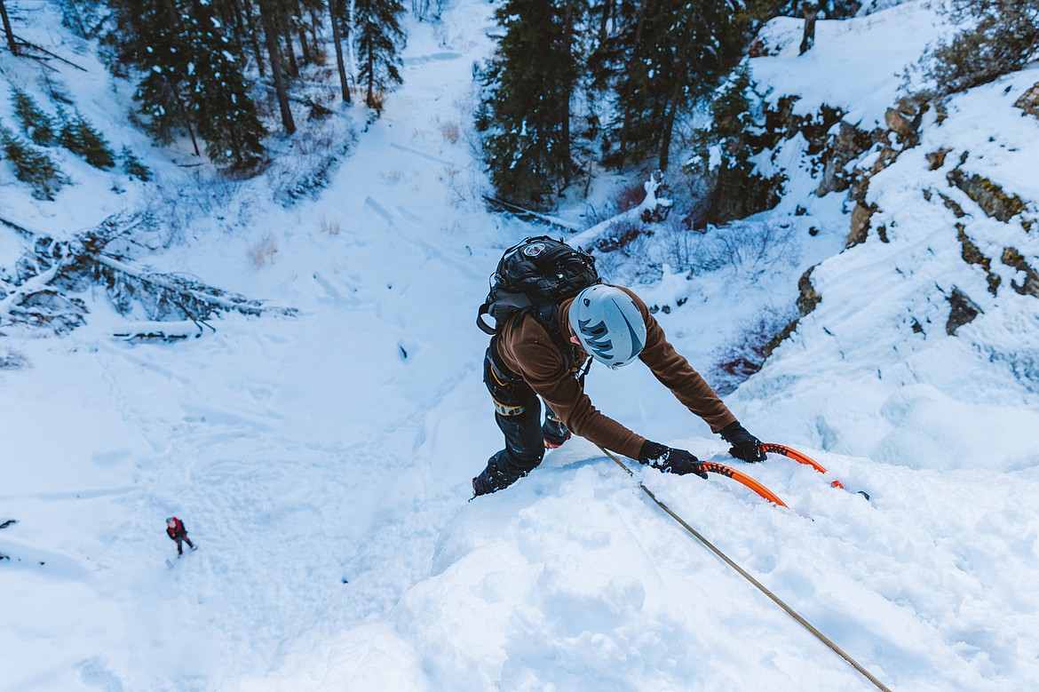 “When taking someone out that doesn’t have any climbing experience at all, we start at the very beginning. Even before we get to rope work, we’re talking about gear and how it works, then just walking in crampons, standing at the base of the ice and swinging the tool into it,” he says. “Ice climbing is all about efficiency and conserving energy. That’s a main focus right off the bat, because you’re using brand new muscles they’ve never used.”