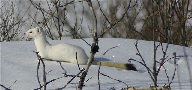 Stirring aftƒer the snowstorms in the subalpine forest are red-backed voles, and field mice who are hunted by the aggressive snow camouflaged long-tailed weasels, aka “ermine.” Also cloaked in winter concealment are white-tailed ptarmigan and the snowshoe hare. Ptarmigan and hares frequently fall victim to the silent, stealthy hunting techniques of the Canadian lynx, stalking on large, snowshoe-like paws and then quickly pouncing on their prey.