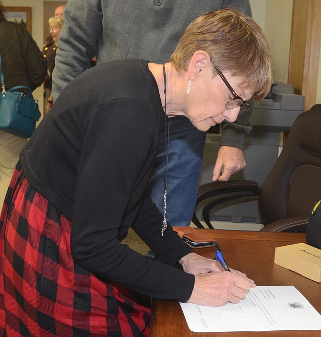 Current commissioner Tony Cox (District 3) administered the oath to Carol Brooker, County Commissioner (District 1); Douglas Dryden, Justice of the Peace; Tom Rummel, Sheriff; and Nicol Scribner, Clerk and Recorder-Treasurer-Superintendent of Schools (combined offices).