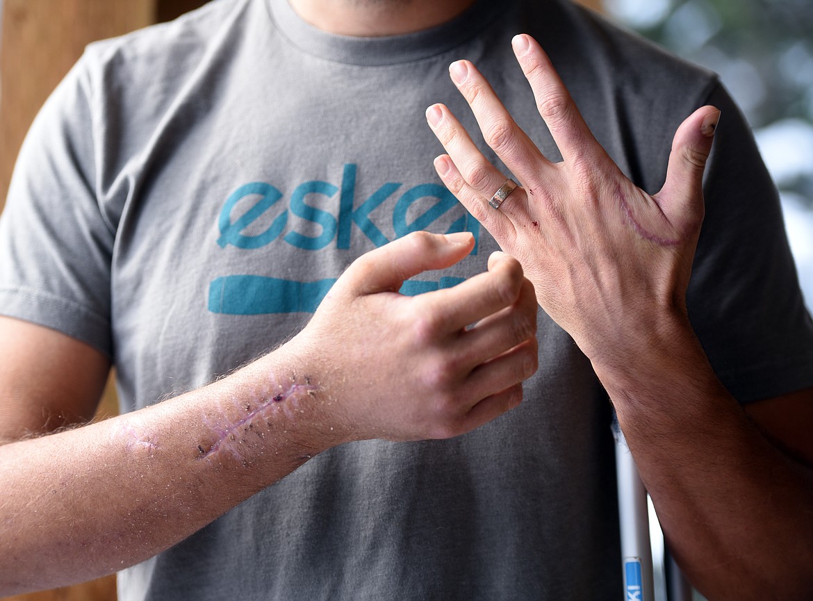 Injuries included a broken radius bone in his right arm, a dislocated right wrist, a fractured thumb, a broken fibula in his left leg, multiple ligament tears in his left ankle and knee, muscle tears and numerous puncture wounds from bites.