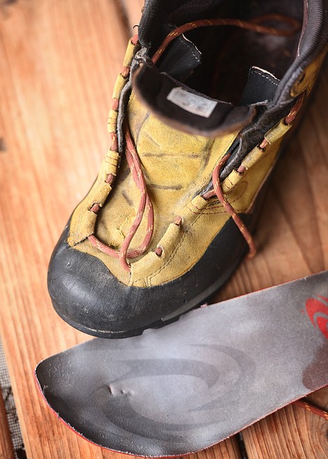 Detail photo of Anders Broste’s left book. Broste said he was told that a grizzly bear bite could be as strong as 1,200 pounds per inch. His boot has penetrating teeth marks in both the top and bottom of the shoe and even the insert he wore was broken through. (Brenda Ahearn/Daily Inter Lake)