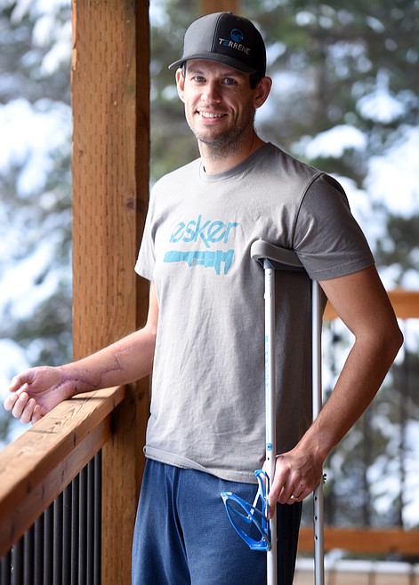 Anders Broste on the back porch of his home in Columbia Falls. Broste has scars on both his arms and is still recovering from a grizzly attack that occurred Nov. 11. (Brenda Ahearn/Daily Inter Lake)