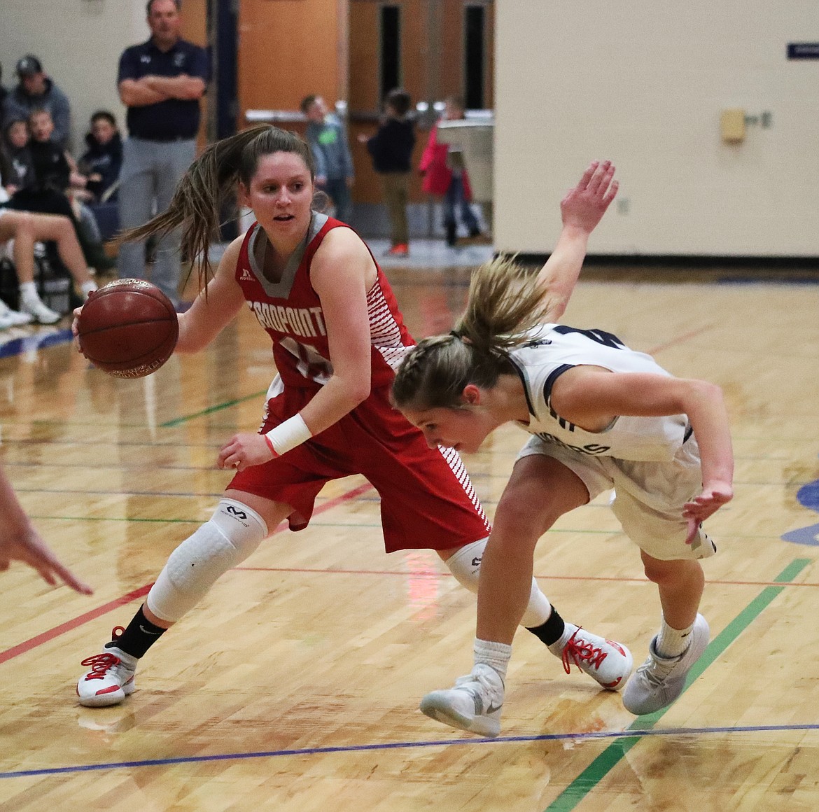 St. Maries senior Kaci Haeg drew contact underneath, sending Driggs to the bench with her fifth foul with 1:27 to play.