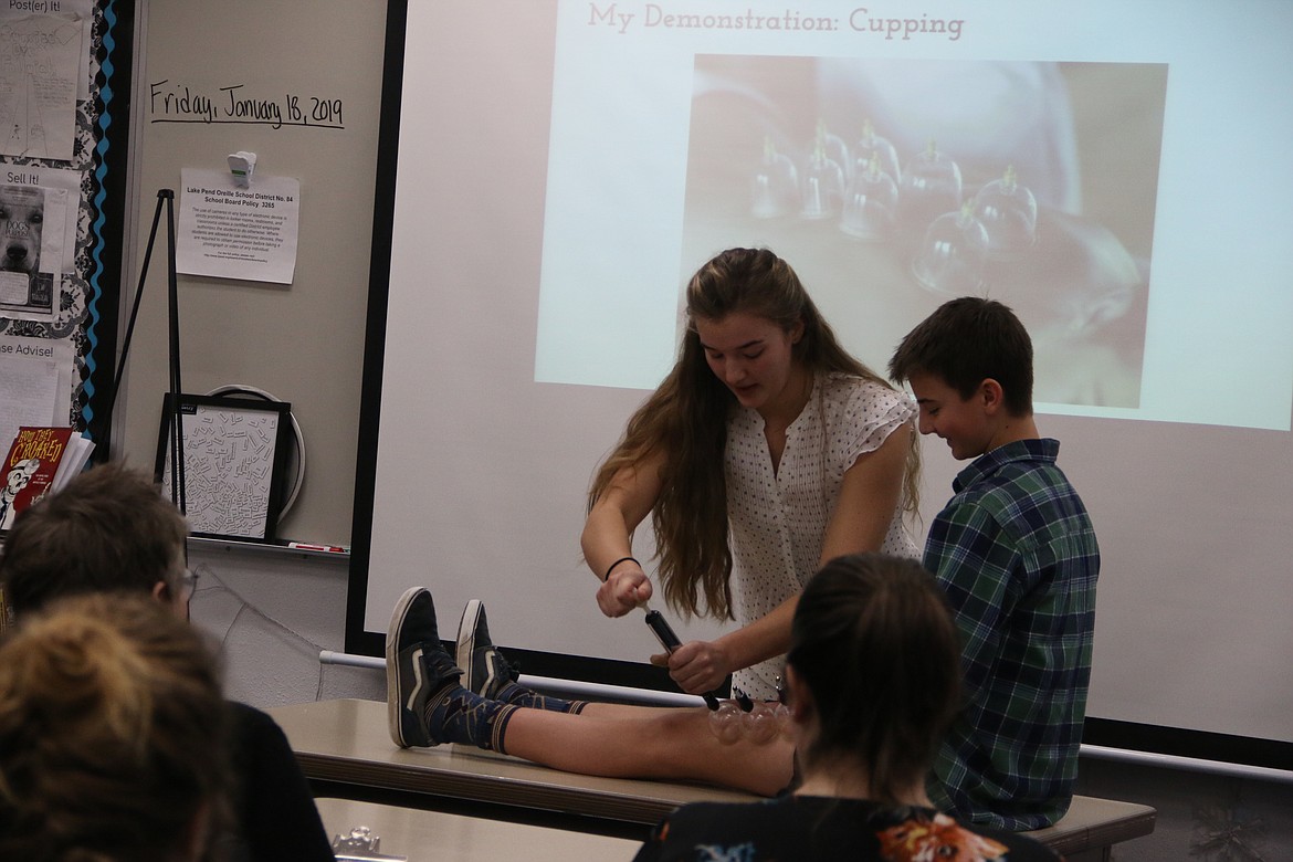 In addition to talking about what they did and learned throughout their experience, each senior was required to do a demonstration as well. Bristol, for example, demonstrated how to do eyelash extensions on a mannequin. The most important thing she learned during her experience she said, was to tape down the bottom eyelashes so as not to glue someone’s eyes shut — which she did once. Bristol said she plans to pursue a career as an esthetician, and will attend beauty school in Coeur d’Alene next year.