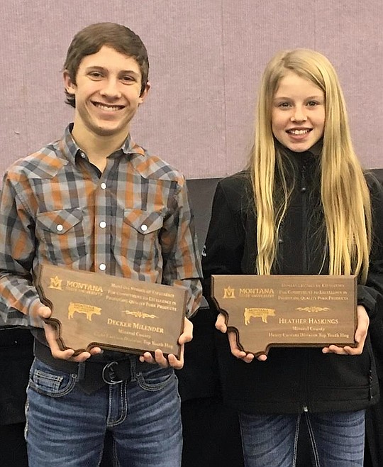 Two Mineral County 4-H members set a new record by becoming state champions in The Montana Symbol of Excellence (SOE) program. Superior students, 13-year-old, Decker Milender and Heather Haskins, 11, won the Montana State University Montana Symbol of Excellence for their commitment to excellence in producing quality pork products. Their 2018, 4-H projects won with Milender winning for the “light carcass division” youth hog and Haskins winning in the “heavy carcass division.”