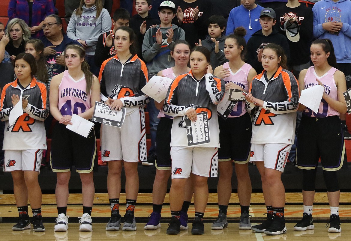 Players on the Ronan and Polson basketball teams joined the Stand Up to Cancer event with a presentation of signs with names of family members, friends and acquaintances who have been affected by cancer.
