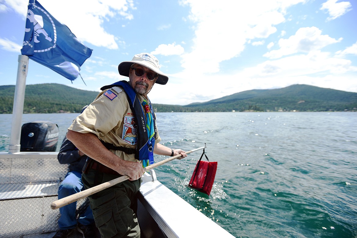 And then the two men climbed in the flotilla’s boat and motored out into the waters of Flathead Lake. They were followed by a boat from Camp Melita Island that was piloted by Luke Venters, a boat driver for the camp.