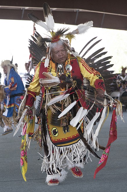 Pierre created many of the war bonnets, feather caps, fans, bustles and other pieces carried and worn by fellow Salish, Kootenai, and Pend d’Oreille tribal members who were dancing in this year’s celebration. He commented that it makes him feel that all those who wear pieces he has repaired or created are family.