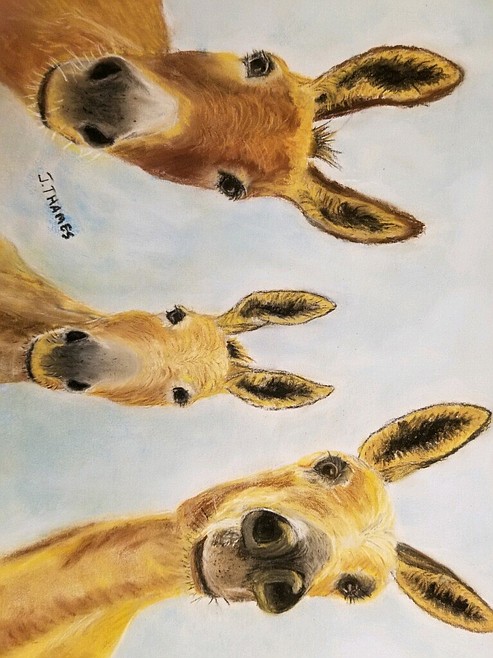 Since then, Juanita has been developing the artistic skills required for portrayals of her subjects in her medium of pastels. But her talent at capturing the subtleties of expression in the eyes and faces of animals makes her art stand out.