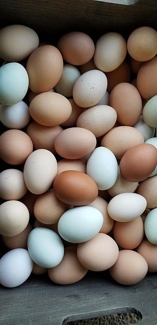 On the farm, don’t expect to see stereotypical white eggs. The Kearl chickens lay an assortment of colors, including different shades of brown, green and even blue eggs. And the chickens themselves are as diverse as their eggs, Caylin says.