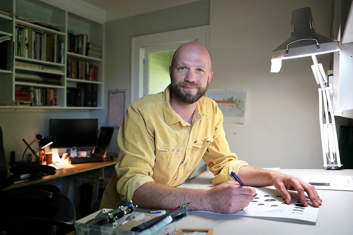 Jonathan Fetter-Vorm draws in his Somers studio the morning of Tuesday, July 9. (Mackenzie Reiss/Daily Inter Lake)