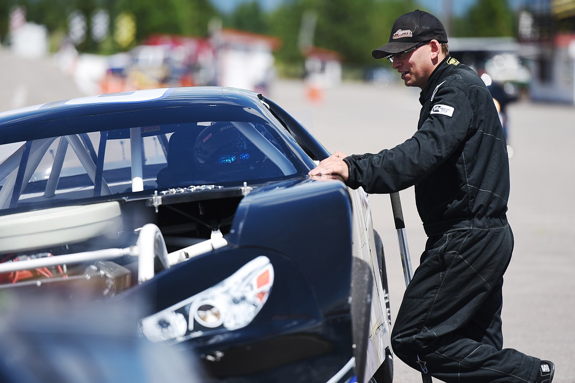 Terry Raymond (12, in car) speaks with fellow driver Logan Jewell (92) in the pit during Super Late Model practice for the Montana 200 at Raceway Park on Thursday. (Casey Kreider/Daily Inter Lake)