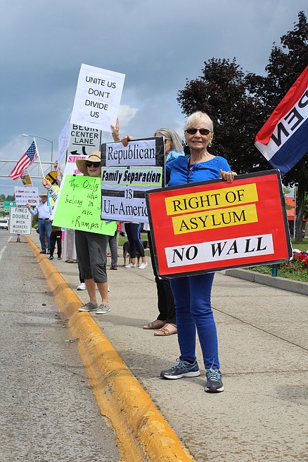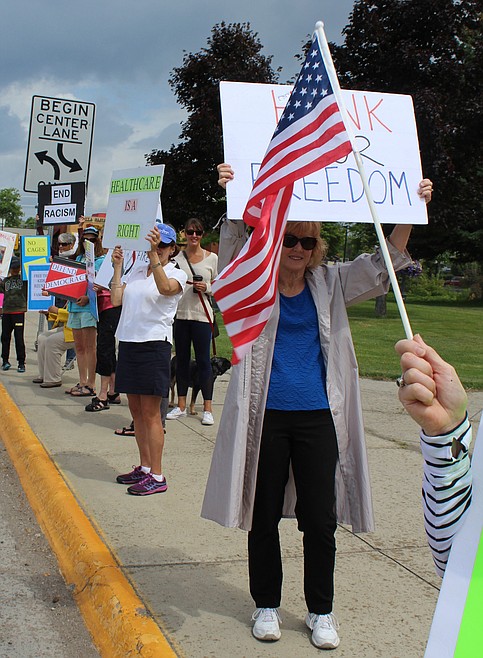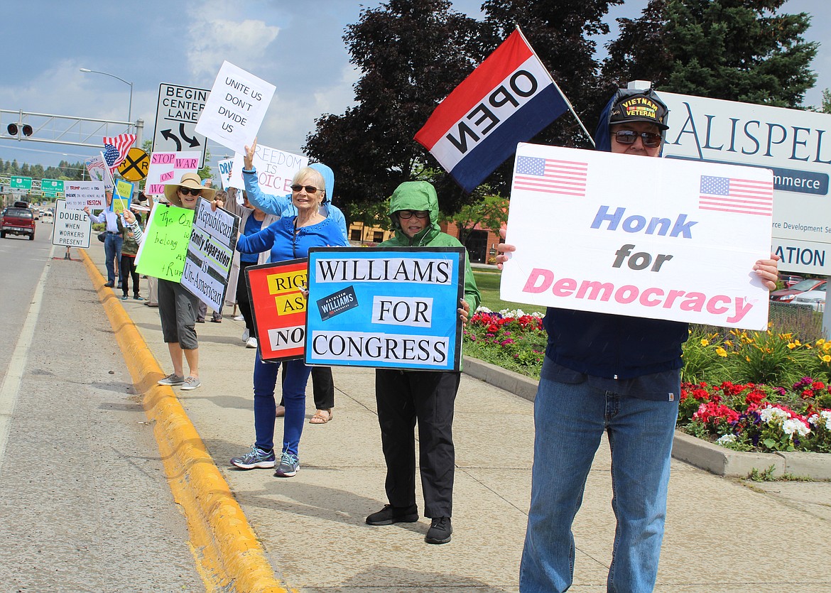 Around midday Tuesday, 21 people stood on the curb along Kalispell’s Main Street near Depot Park. Their placards displayed messages intended to offer an alternative to the division and rancor they allege is sown by President Donald Trump.