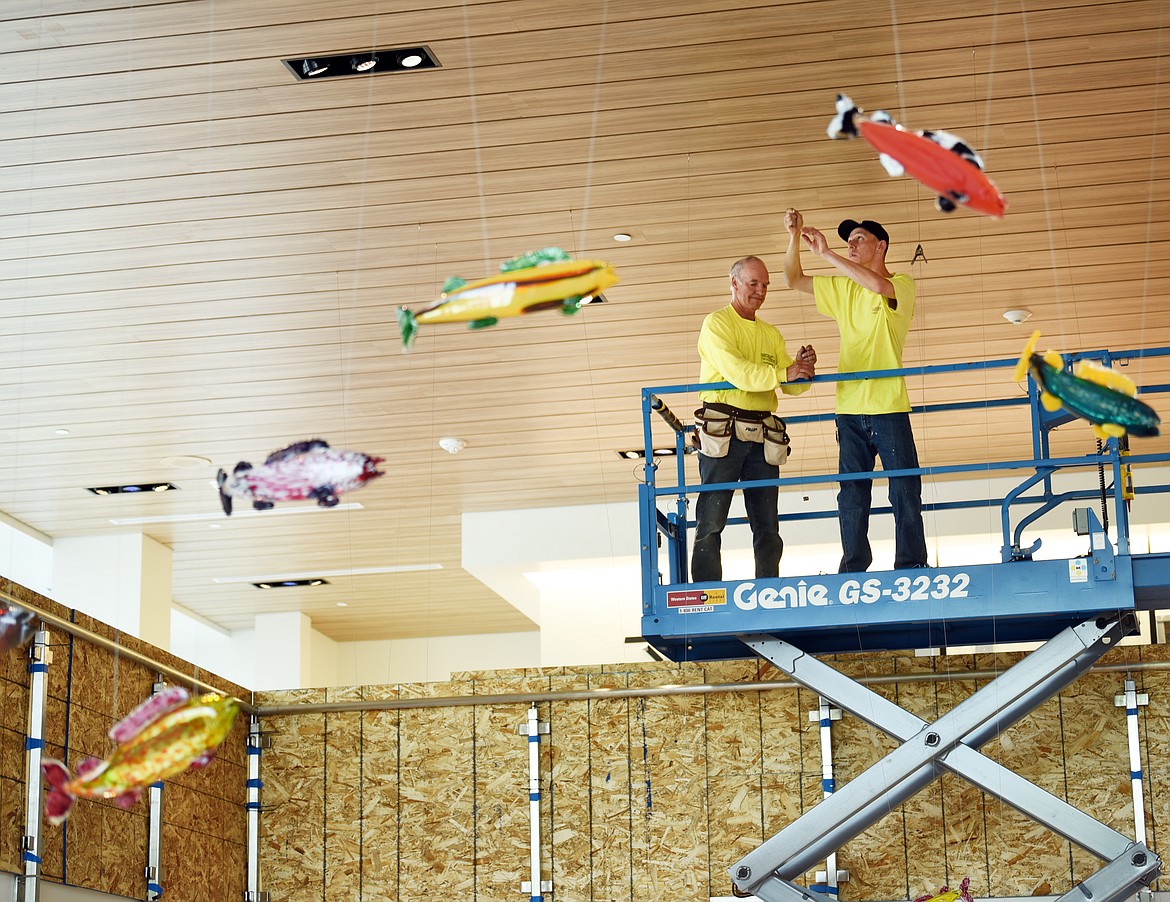 Detail of some of the glass fish already hung at Montana Children’s. Steven Personette, of Lilienthal Installation Co., said these are his two favorites because he was able to hang them directly under some of the lighting in ceiling, which highlights them. Personette pointed out the fish are mirroring the pattern of the river on the floor of the space. (Brenda Ahearn/Daily Inter Lake)