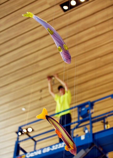 Detail of one of about sixty glass fish by artist George Bland being installed at Montana Children’s at Kalispell Regional Medical Center on Friday, May 31. Bland said that each fish take about 3 man hours to make. (Brenda Ahearn/Daily Inter Lake)