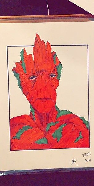 His most recent works vary in scope and substance but emerge through either graphite pencil drawings or acrylic painting. The drawings craft thin edges around the detailed features of faces. His acrylics burst with color to depict fictional characters of pop culture’s past.