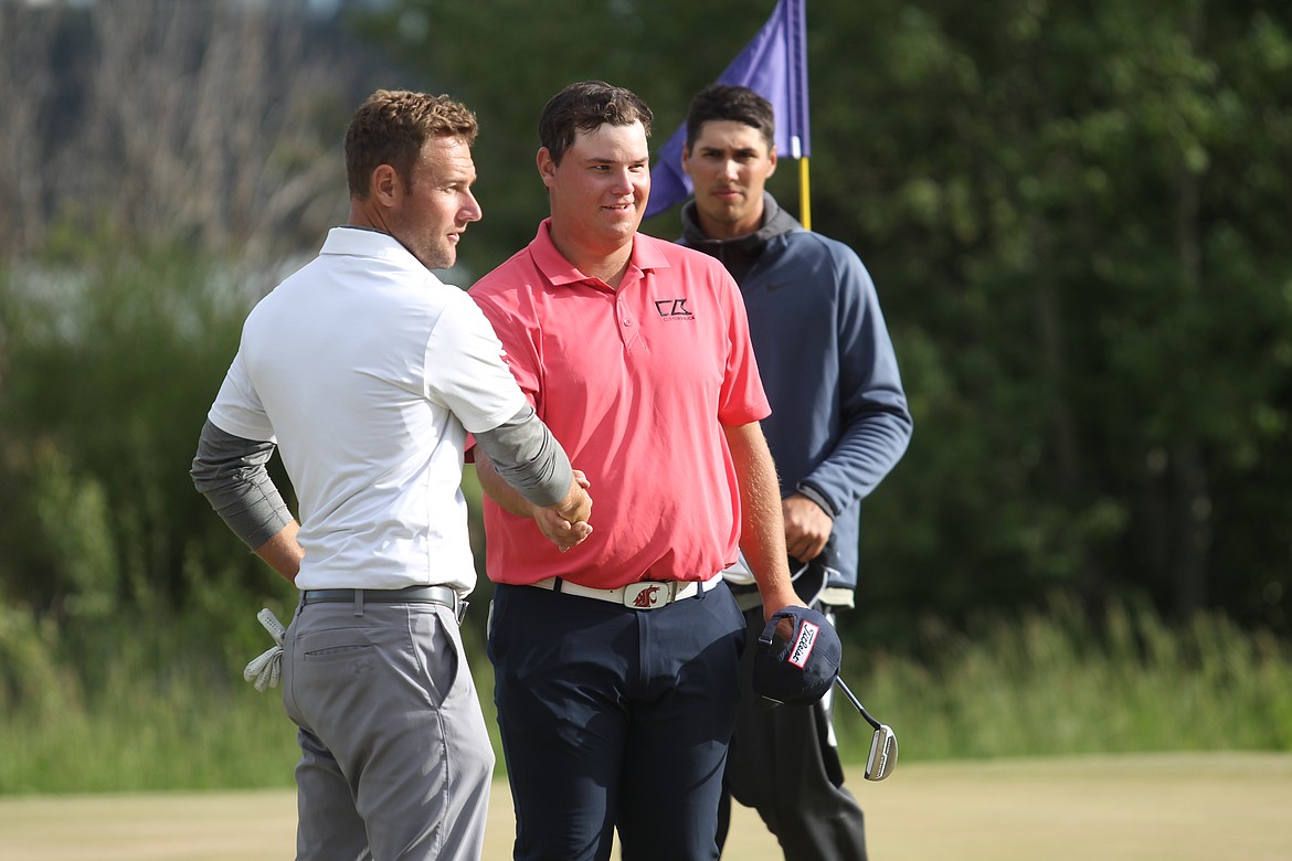 Russell Grove, left, and Derek Bayley shake hands after completing the third round of the Lilac City Invitational on Saturday at The Fairways at West Terrace. At right is Bayleys caddy, Jake Ram. Bayley and Ram played basketball together at Lakeland High.