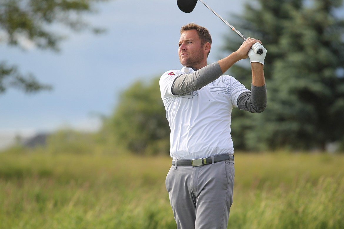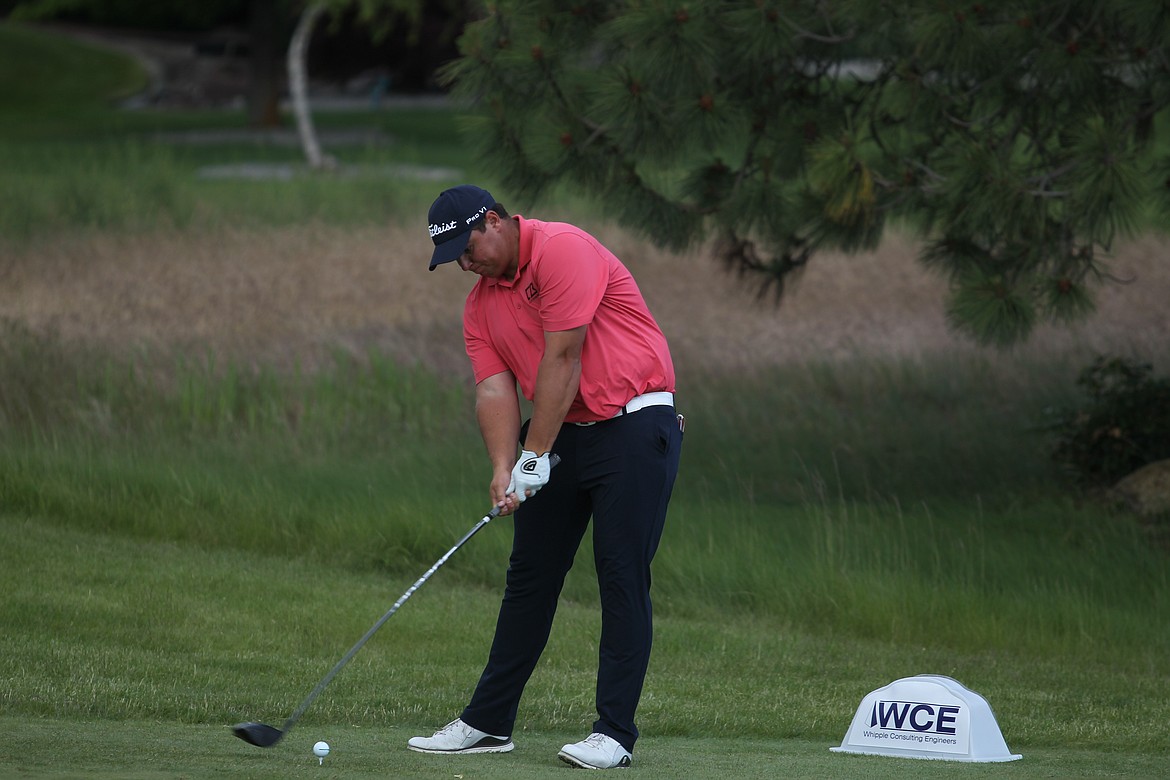 Russell Grove hits his tee shot on the 18th hole in the third round of the Lilac City Invitational at The Fairways.