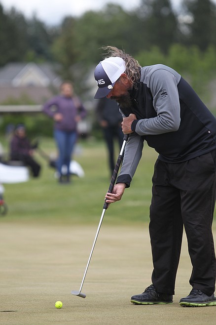 Billy Bomar, co-owner of Prairie Falls Golf Course in Post Falls, uses his side-saddle method to putt on the 13th hole Saturday in the third round of the Lilac City Invitational at The Fairways at West Terrace.