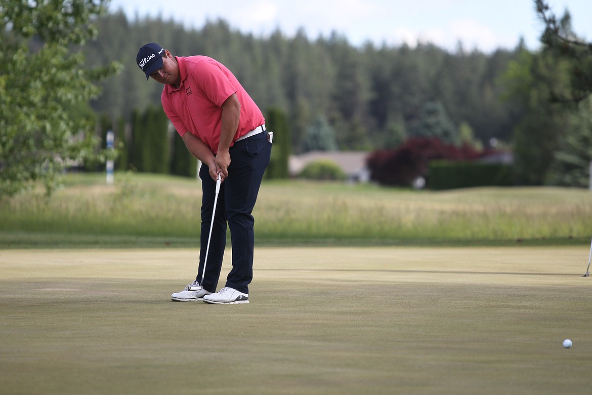 Derek Bayley of Rathdrum watches his putt on the 16th hole Saturday during the third round of the Lilac City Invitational.