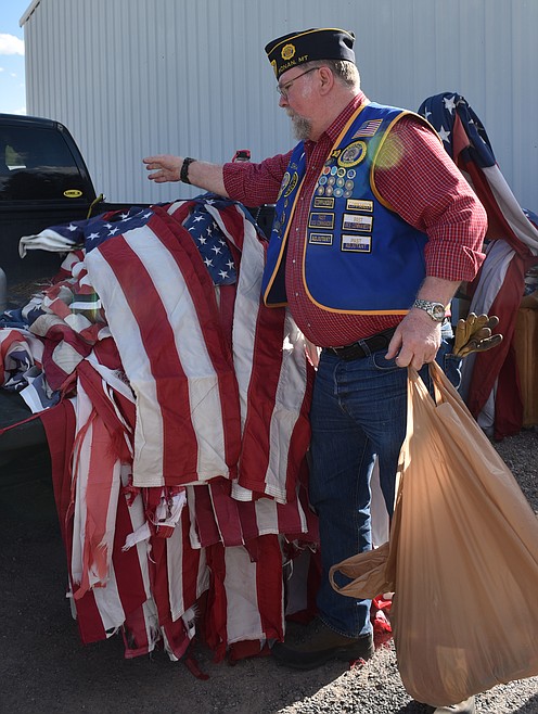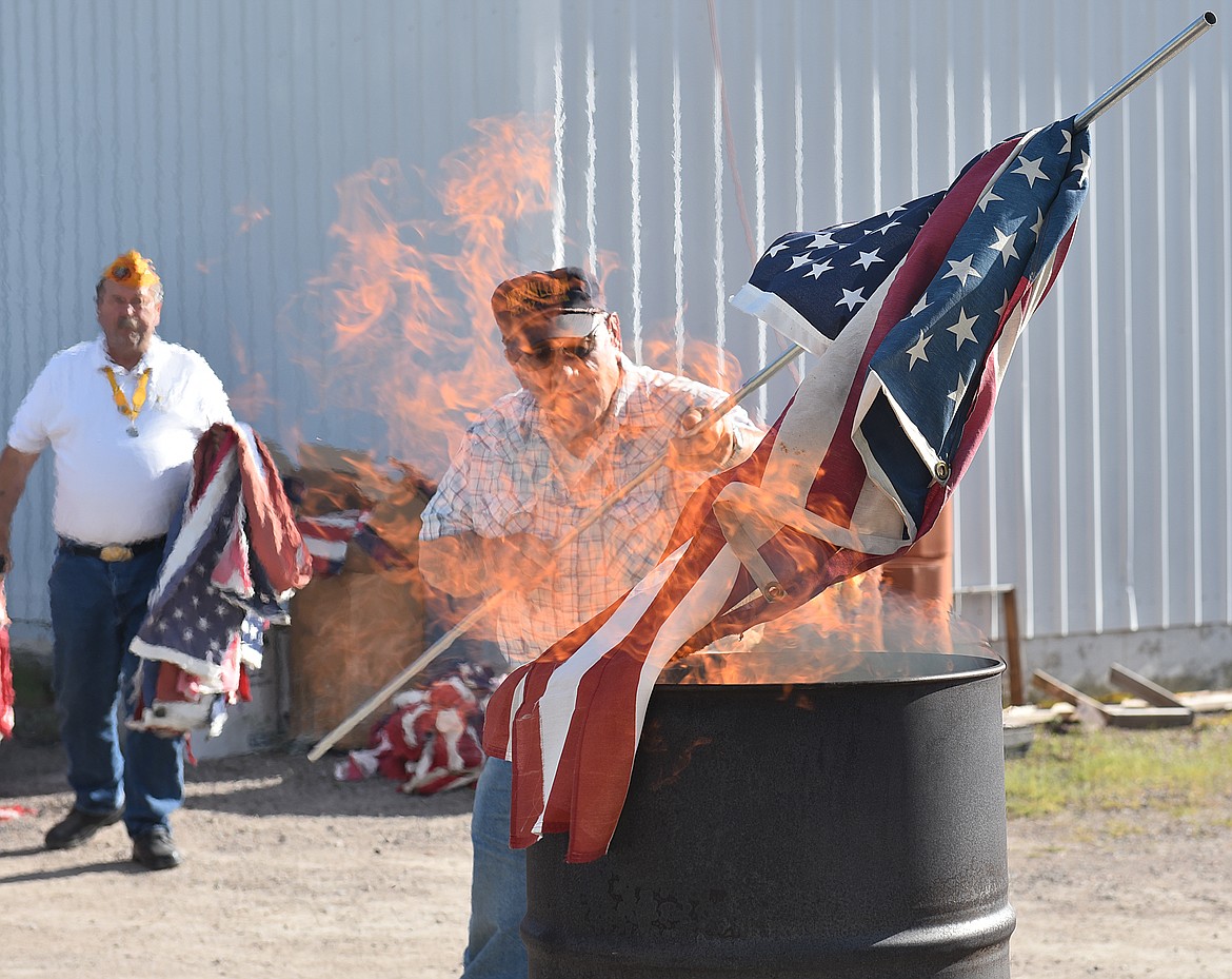 In solemn ceremony, members of American Legion Post 112, Marine Corps League of Polson, and VFW gathered on Flag Day, June 14, at Lakeview Cemetery to respectfully retire about a hundred worn U.S. flags.