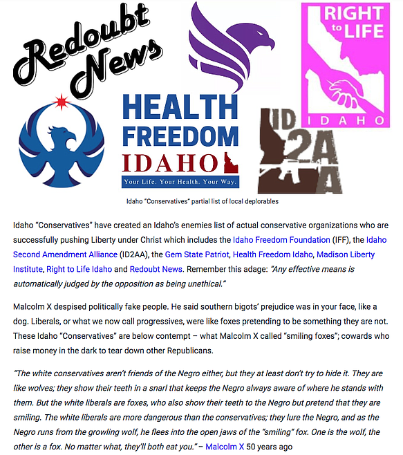 “Malcolm X despised politically fake people,” Barron wrote. “He said southern bigots’ prejudice was in your face, like a dog. Liberals, or what we now call progressives, were like foxes pretending to be something they are not. These Idaho ‘Conservatives’ are below contempt — what Malcolm X called ‘smiling foxes’; cowards who raise money in the dark to tear down other Republicans.”
