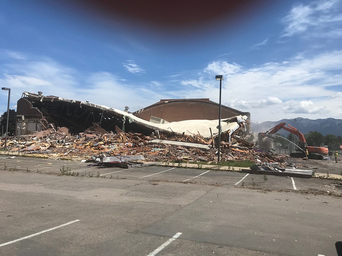 The Linderman Elementary School gymnasium demolished late Tuesday morning.