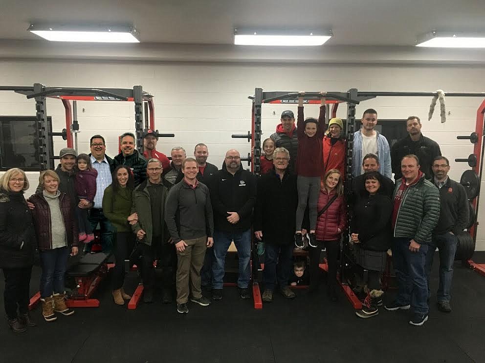 A group of Sandpoint boosters, alumni, school officials and small business owners pose together in Sandpoint High School’s renovated weight room. school is not only very appreciative of local support, but would also like to thank the Lake Pend Oreille Poker Run, Bulldog Bench, Yoke’s, LPOSD Maintenance Department, Mia Kohal-Painting, Litehouse, Greg and Laurel Taylor and Family and the SHS Athletic Department for making the new weight room equipment possible.