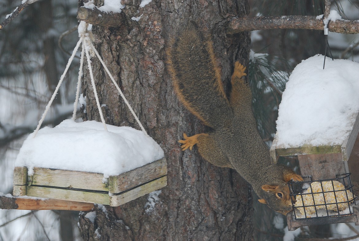 Squirrels can be busy little fellas, living out their lives running around gathering and hoarding food, mating and raising young. During the snowstorm last weekend I watched a busy fox squirrel as he raided the suet block at our bird feeder. He would quickly eat, hesitate, look around to see if there were any intruders, and then continue with his feast.