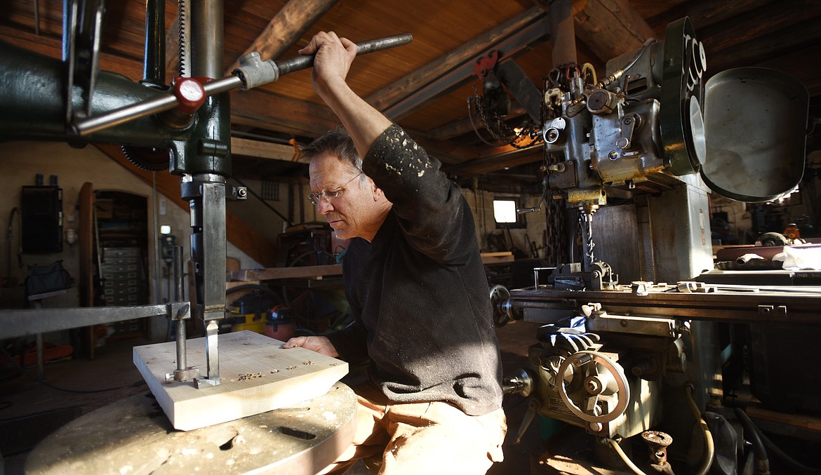 David Secrest drills holes into a piece of elm in his studio in Somers on Thursday, February 21.(Brenda Ahearn/Daily Inter Lake)