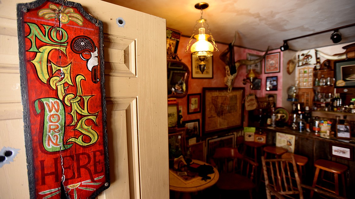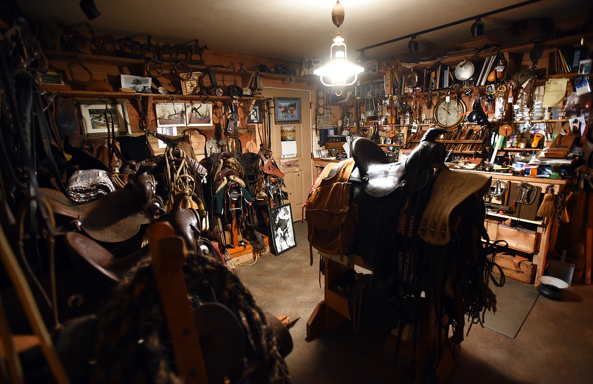 He leads visitors through rooms filled with coyote and beaver pelts, traps, buffalo robes, saddles, horse collars, neck yokes, bison skulls, tomahawks, watch fobs, powder horns, hatchets, knives, axes, cowboy hats, top hats, buffalo drums, Native American artifacts, rabbit fur mittens, crosscut saws and much, much more.