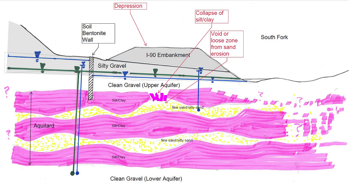 The second option involves underground water making its way through the aquitard and under the interstate through the use of old water channels. Undetected old channels comprised of more permeable soils could theoretically give the water a new path to flow.