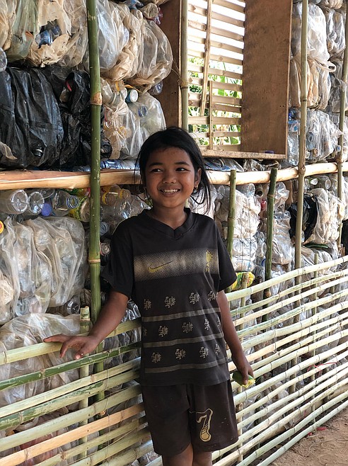 A Cambodian student is pictured with a bin of plastic that will be used in building construction at the Red Road Foundation’s facilities in southern Cambodia.